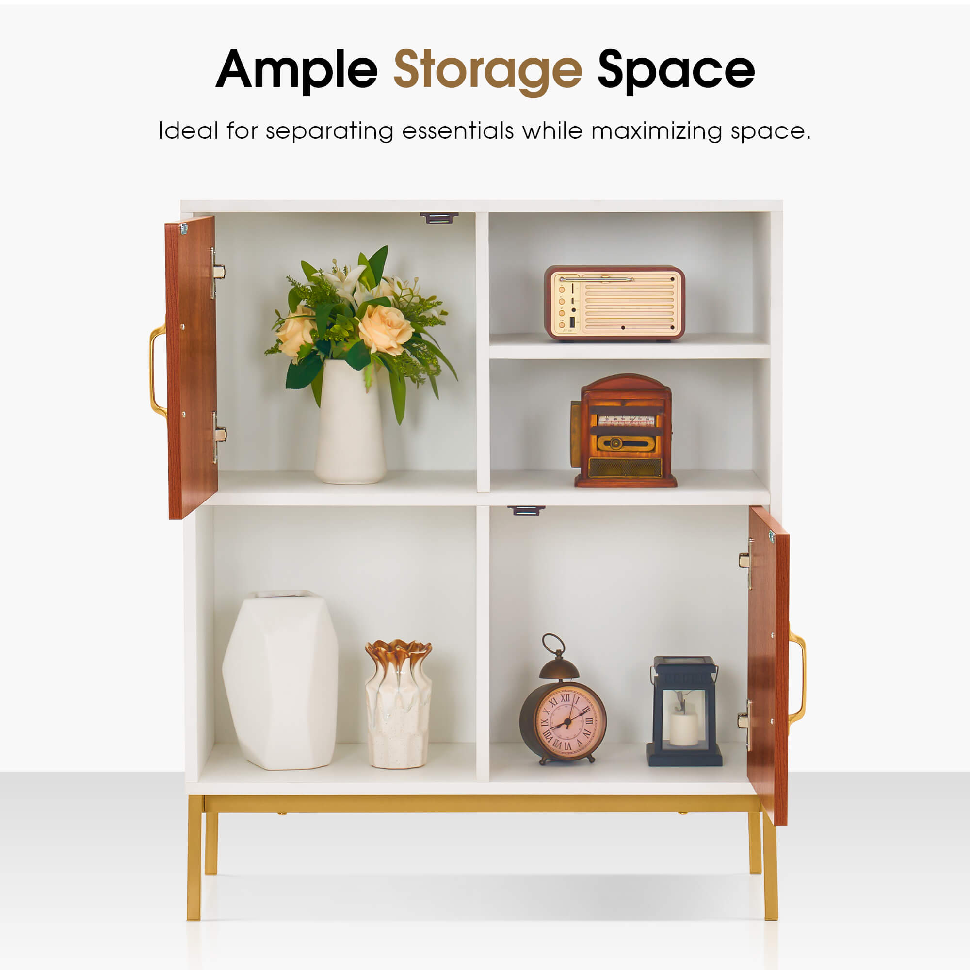 - Stylish Mid-Century Modern Buffet Cabinet: This mid-century modern sideboard features a sleek white frame, cherry brown doors, and gold hardware, adding a chic, retro-modern look to your entryway, kitchen, or living room. Ideal as a buffet cabinet, console table, or sideboard unit