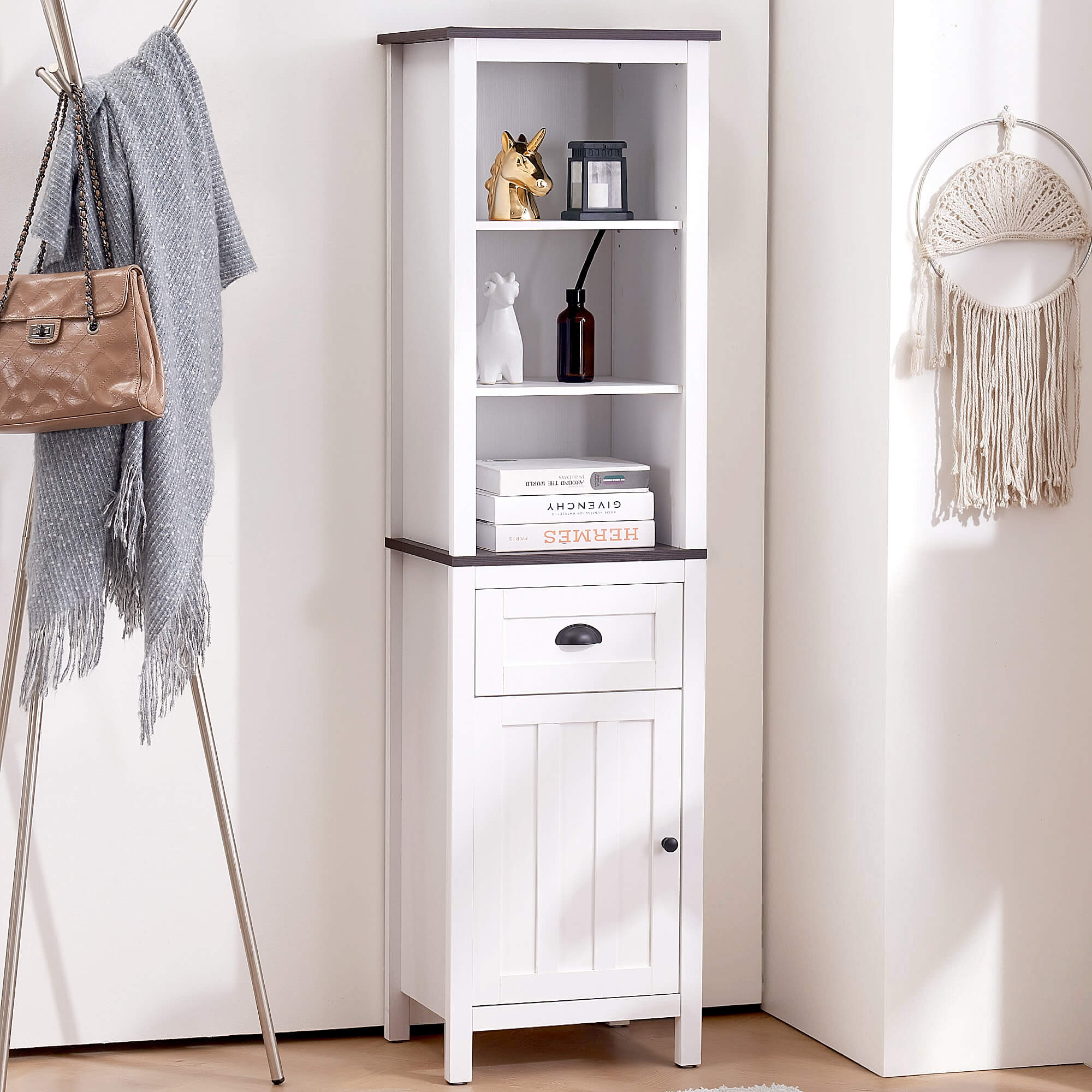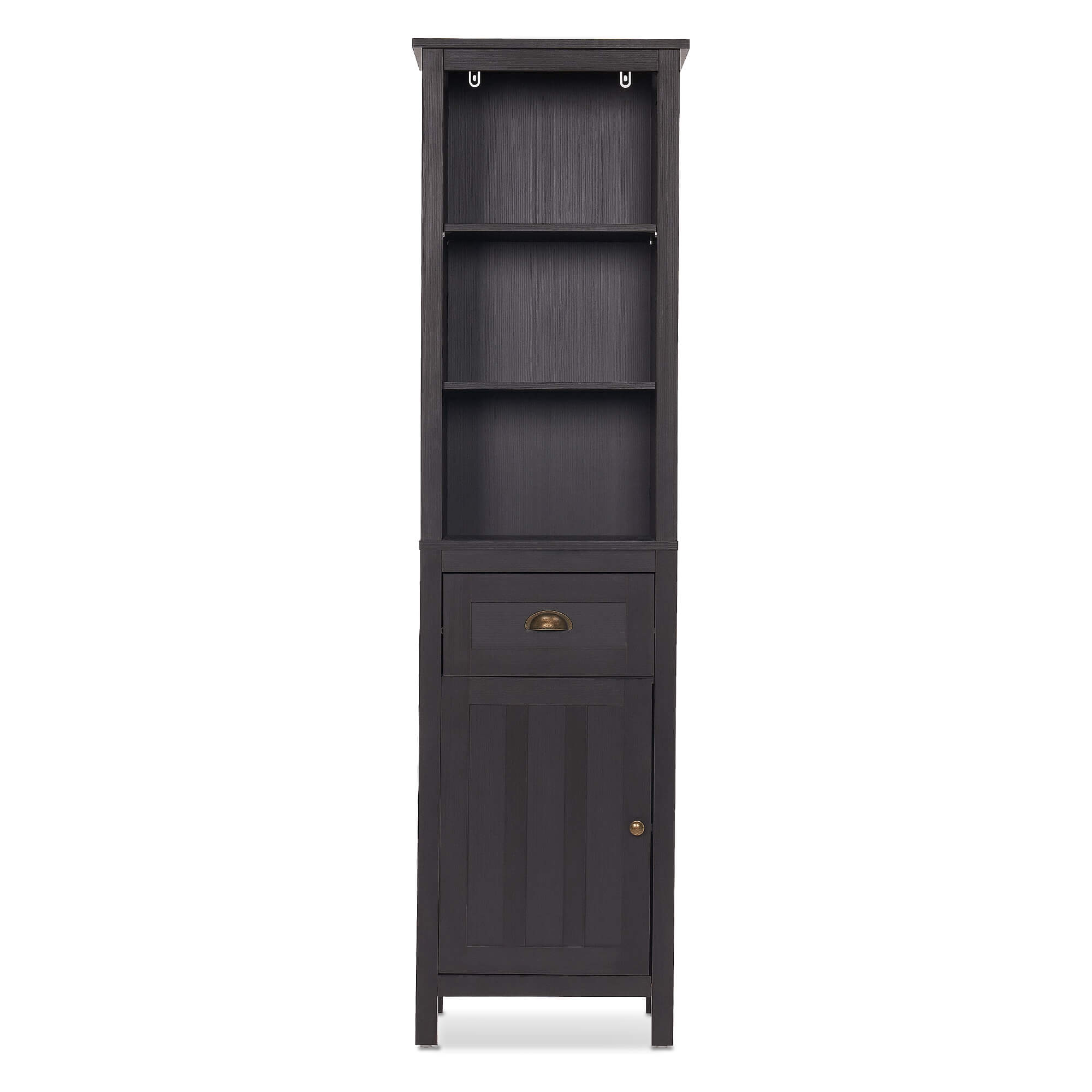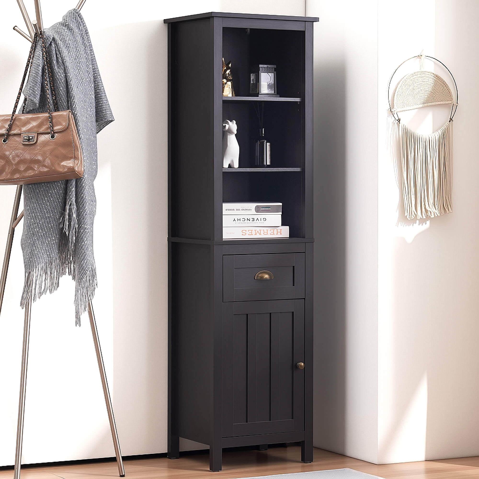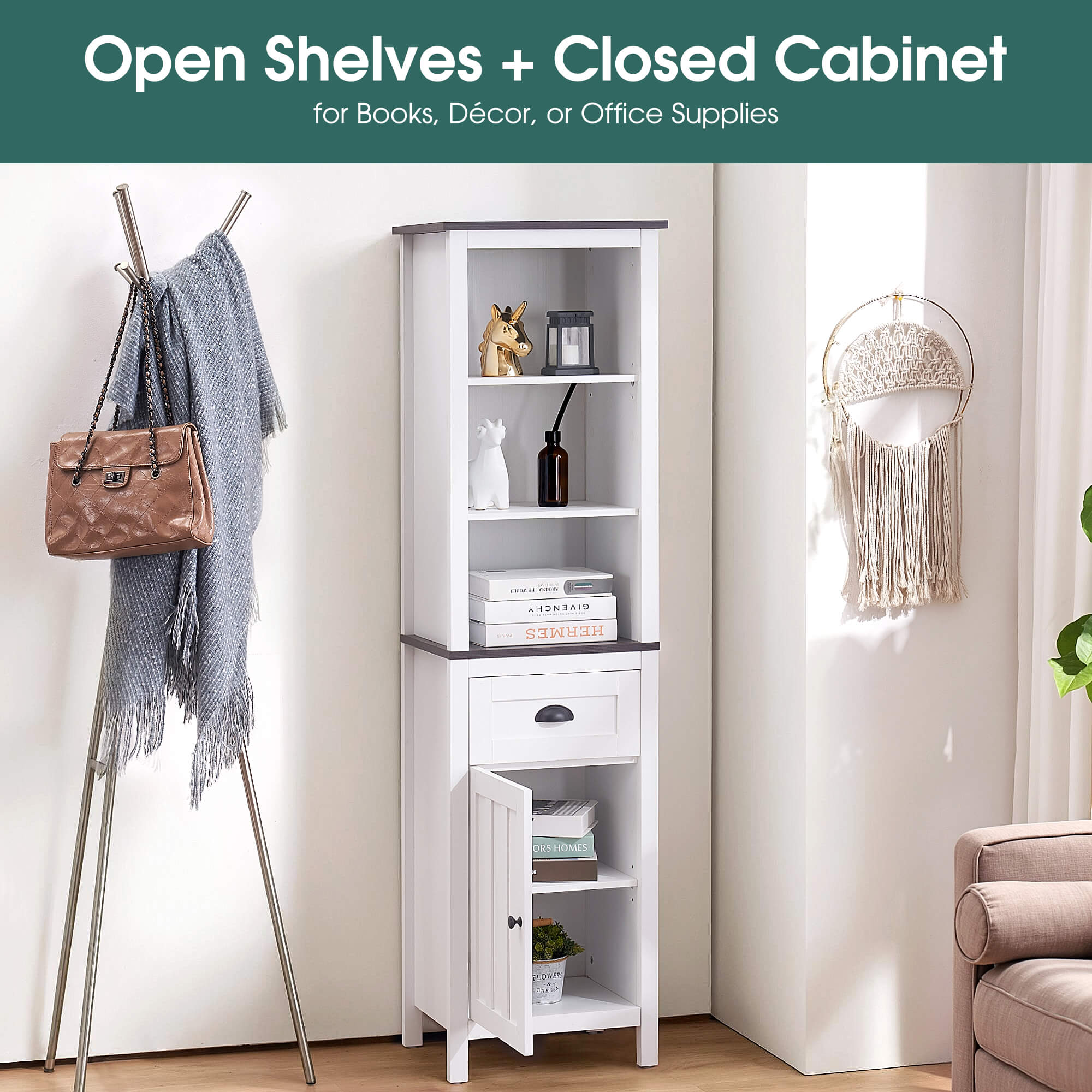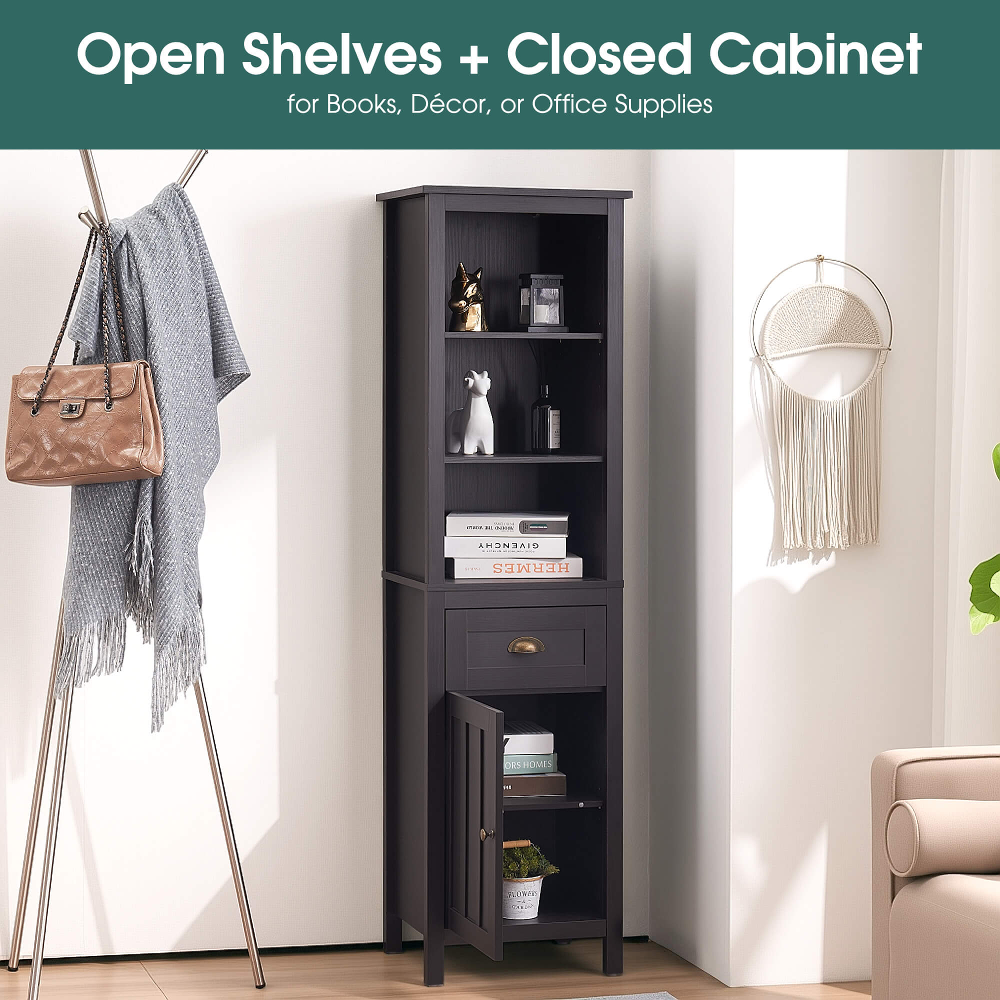 - 63.8"H Tall Bathroom Cabinet: This freestanding bathroom storage cabinet features 3 open shelves for towels, toiletries, or décor, plus 1 drawer and a 2-tier cabinet for hidden essentials. A space-saving solution to reduce clutter and keep your bathroom neat and organized. Overall Dimensions: 14.4"D x 17.5"W x 63.8"H
